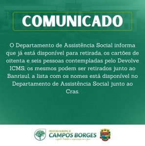O Departamento de Assistência Social informa que já está disponível para retirada, os cartões de oitenta e seis pessoas contempladas pelo Devolve ICMS, os mesmos podem ser retirados junto ao Banrisul, a lista com os nomes está disponível no Departamento de Assistência Social junto ao Cras.