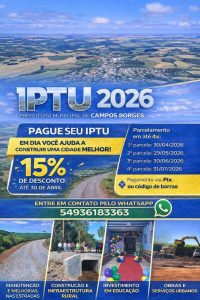 Manter o IPTU 2026 em dia é investir diretamente em Campos Borges. Até 30 de abril, você garante 15% de desconto no pagamento à vista.Preferindo parcelar, dá para pagar em até 4x: